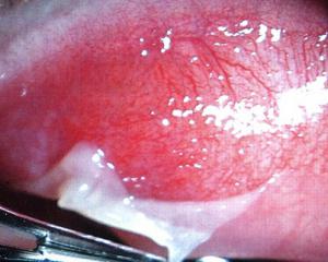 Отделяемое по краям век и на конъюнктиве незначительное, слизистого типа. Конъюнктива век и переходных складок гиперемирована, есть отек, с большей или меньшей фолликулярной реакцией и с появлением на веках легко снимающихся пленок. Эти симптомы дополняются ощущением присутствия инородного тела, зудом и жжением, слезотечением, светобоязнью, небольшим блефароспазмом.