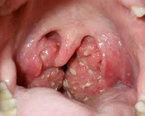 Острая фаза ангины начинается с повышения температуры. Начальная стадия протекает весьма остро. Признаки интоксикации проявляются в потливости, слабости, потере аппетита и головной боли. Резко увеличиваются в размерах миндалины с характерным покраснением и образованием налета. Боль в зеве не дает возможности нормально глотать. Лимфоузлы расположенные под ухом и нижней челюстью увеличиваются с проявлением болезненности.