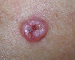 Розоватая или телесного цвета папула или бляшка, медленно увеличивающаяся в размерах. | Фото: Плоское, слегка возвышающееся пятно, возможно с телеангиэктазиями (расширенными кровеносными сосудами). Может быть перламутровым или восковым блеском. | Хирургическое иссечение, криодеструкция, лучевая терапия, фотодинамическая терапия. |