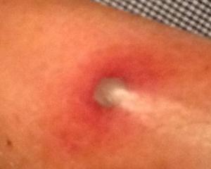 - 2) Стадия нагноения и некротических изменений наступает на 3 день от момента появления инфильтрата. В этот период формируется гнойно – некротический стержень, который выступает на поверхности воспаленного уплотнения в виде белой пустулы. У некоторых пациентов страдает общее самочувствие: температура тела поднимается до субфебрильных цифр (37 – 38 градусов), отмечается общее недомогание, нарушение аппетита и др. В области фурункула ощущается боль. В этот период чаще всего фурункул вскрывается и из него выходит стержень и гной. После вскрытия исчезают общие симптомы интоксикации, заметно уменьшается отечность тканей, окружающие инфильтрат и боль в области него.