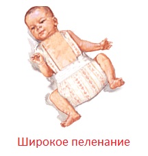 - 1) Широкое пеленание – самый доступный способ, выполнить может даже молодая мама, используют при не осложненных формах.