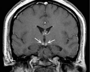 - Энцефалопатия Вернике, возникающая из-за нехватки тиамина, с поражением таламуса и среднего мозга.