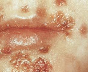 Язвы с медово-желтой коркой | Пузырьки лопаются, образуя язвы, покрытые характерной медово-желтой коркой. | [Ссылка на изображение с язвами и коркой] |