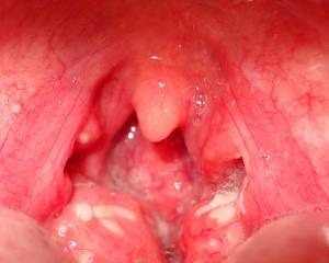 Ангина по форме течения: Горло красное, с небольшим отёком, фолликулярная — на поверхности миндалин появляются маленькие желтовато-белые гнойные пятна (гнойные фолликулы), лакунарная — гной скапливается в полостях миндалин (лакунах) и образует на их поверхности желтовато-белые пятна.