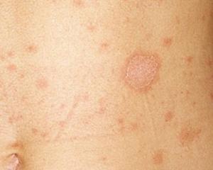 - Лишай Жибера, который начинается с появления «материнского» пятна, а затем их количество увеличивается. «Дочерние» пятна значительно меньше по размеру, чем «материнское»;