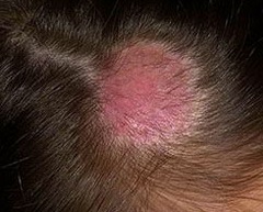 На голове в зоне роста волос наблюдаются участки с черными точками, которые находятся вровень с кожей и являются показателем заболевания. Это результат обламывания волос по причине грибкового поражения. Появляются шелушащиеся очаги с синеватым оттенком, местами можно наблюдать атрофированную кожу с мелкими рубчиками.