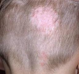 На коже головы в области роста волос стригущий лишай проявляется в виде круглых участков неправильной формы, которые резко выделяются на фоне здоровой кожи и покрыты отрубевидными чешуйками серо-белого оттенка.